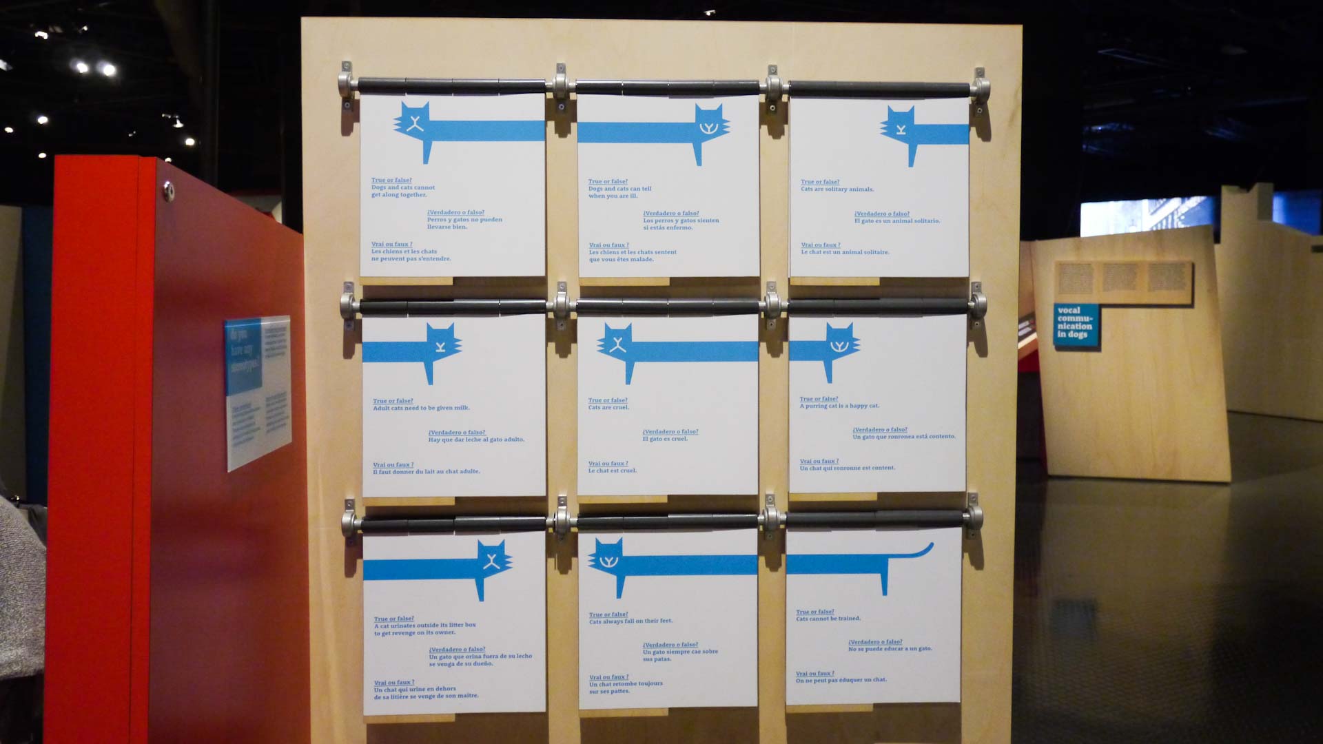 Partly to bust common myths and partly to educate the public, Cats and Dogs at Science World also has a number of trivia-type stations. There are true-or-false boards, a multiple-choice versus game, and audio experiences to match a cat’s or dog’s vocalizations with what they’re trying to communicate. Small dogs aren’t necessarily best for apartment dwellers, and cats don’t always land on their feet.
